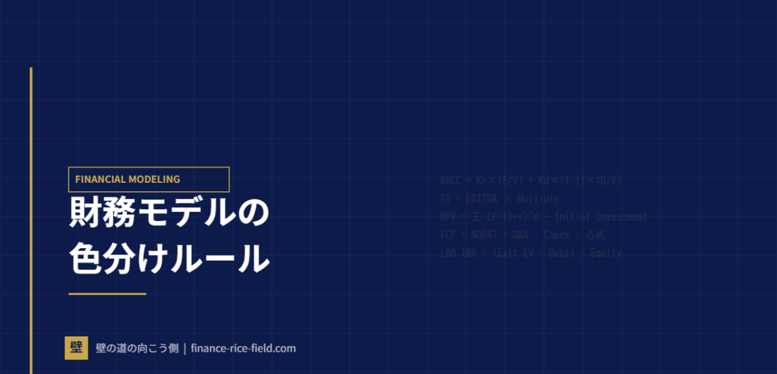 財務モデルの色分けは、投資銀行やPEファンドで働くプロフェッショナルが必ず守る業界共通ルールです。ハードコードされた数値は青、計算式は黒、外部シートへのリンクは緑——この単純なルールを徹底するだけで、モデルの可読性とエラー発見速度が劇的に向上します。本記事ではM&Aアドバイザーの実務で使われる財務モデル色分けの標準ルールと、Excelでの効率的な実装方法を解説します。