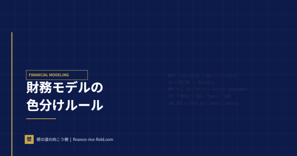 財務モデルの色分けは、投資銀行やPEファンドで働くプロフェッショナルが必ず守る業界共通ルールです。ハードコードされた数値は青、計算式は黒、外部シートへのリンクは緑——この単純なルールを徹底するだけで、モデルの可読性とエラー発見速度が劇的に向上します。本記事ではM&Aアドバイザーの実務で使われる財務モデル色分けの標準ルールと、Excelでの効率的な実装方法を解説します。